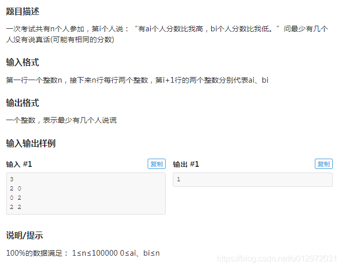 - 可以将每个人的话转化为一个相同分数段,即[b+1,n-a]。如果某个区段分数的人数超过了区段长度,就有超过区段长度数量的人说假话.
