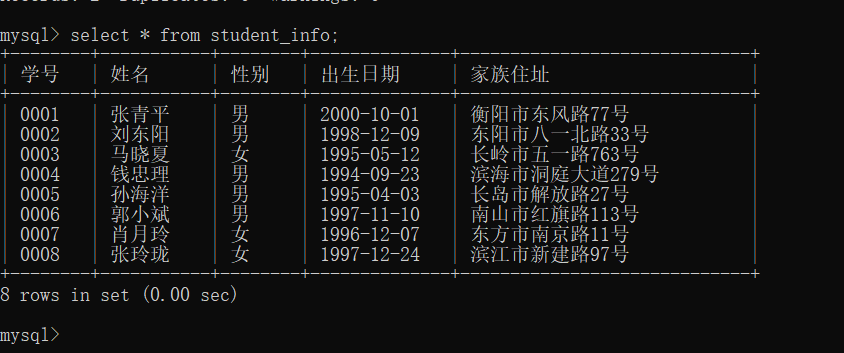 -> ("0008","张玲珑","女",'1997-12-24',"滨江市新建路97号");