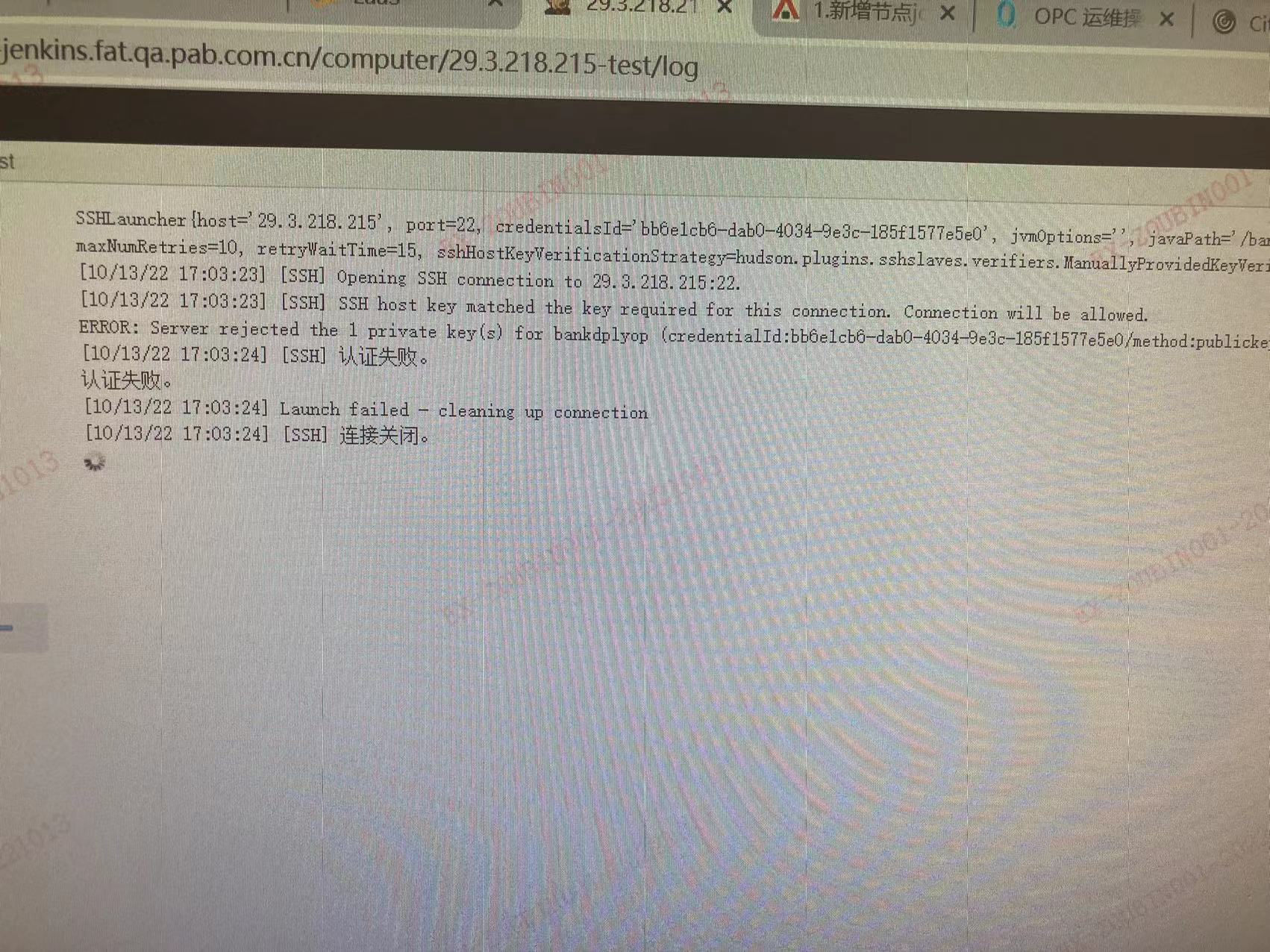 像上图这个报错,提示jenkins主节点的公钥没有推送到从节点,导致认证失败,解决办法就是推送公钥