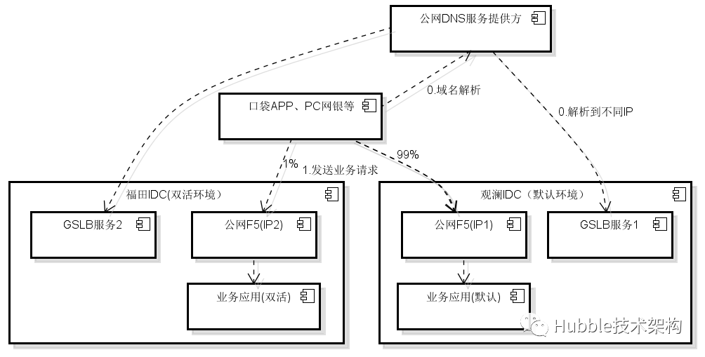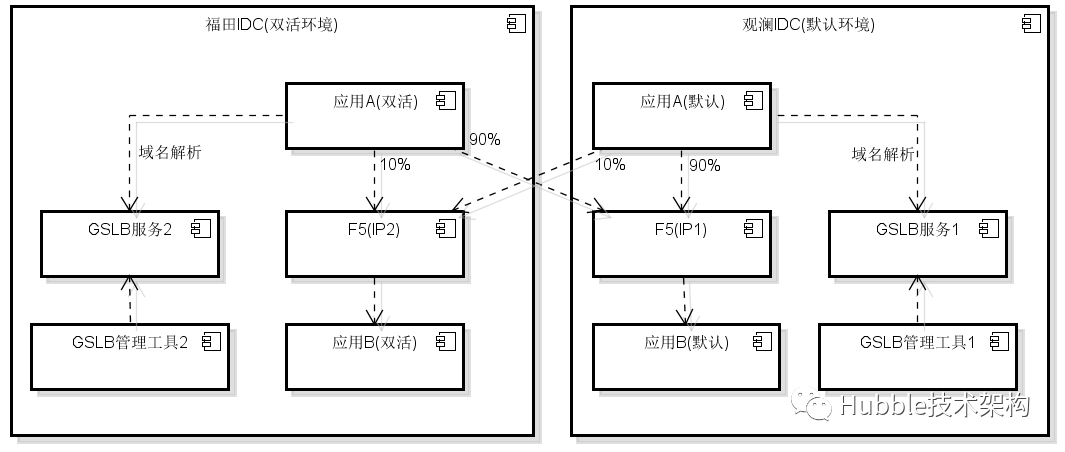 1. 通过GSLB管理工具,进行分流策略管理。应用调用时,进行域名解析时,根据分流策略(按比例)返回不同IP,实现分流。