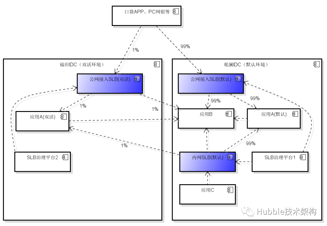 2. 内网SLB,上图示例中,假设应用C通过内网SLB调用应用A,需要通过分流策略,将部分流量分流到应用A的双活集群。这种情况下,需要在SLB治理平台上,设定分流策略。