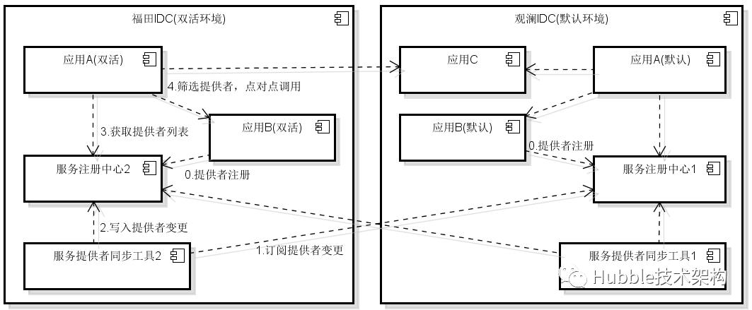 4. 当其中某一环境不可用时,对方环境的服务同步者工具侦测到,自动删除对方环境的提供者。
