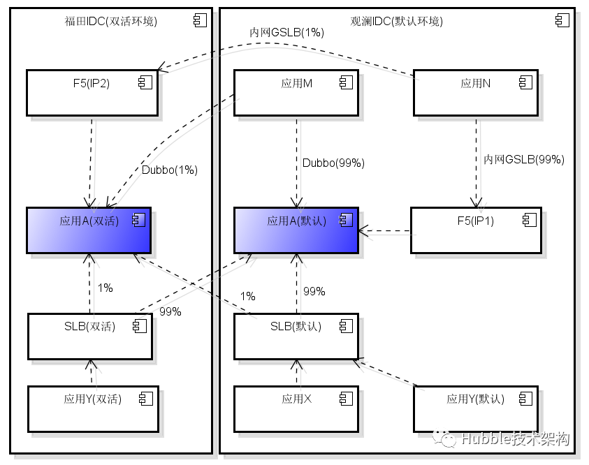 如果应用系统的调用方或主要接入渠道,都没有实现双活,那只能自己在应用系统维度设定分流策略(IDC权重),导入部分流量来验证自己的双活环境和双活能力。例如: