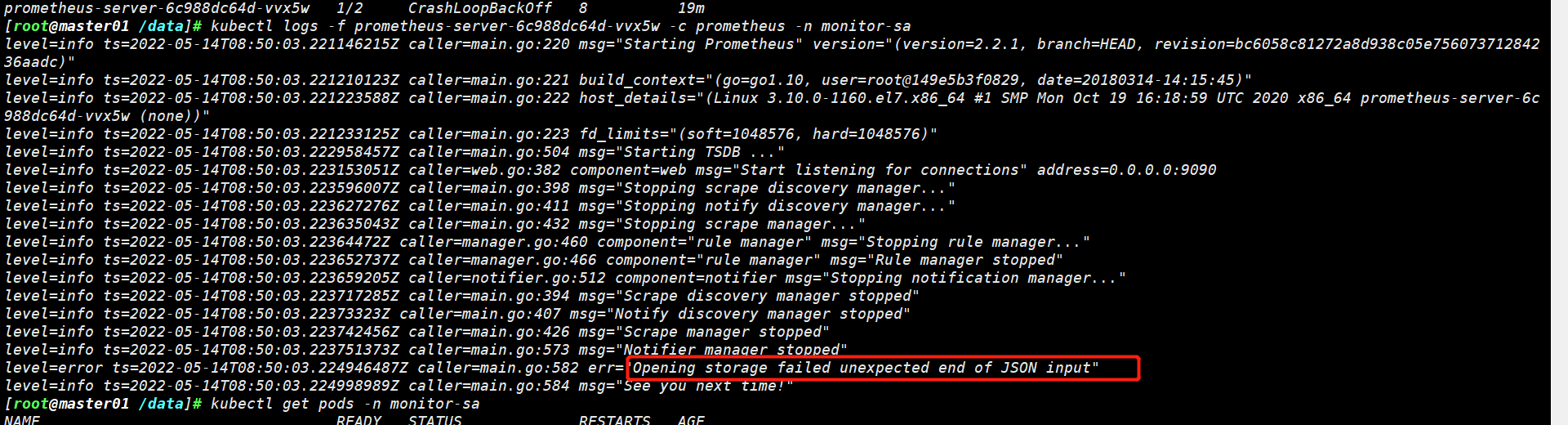 k8s 用pod 创建的prometheus ,虚拟机断电关机,导致普米无法起来,报错Opening storage failed unexpected end of JSON input