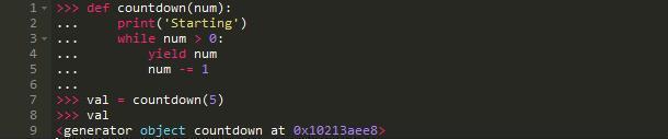调用这个函数并未真正执行它。我们知道是因为字符串'strings'并未打印。相反,函数返回一个生成器对象用来控制执行。