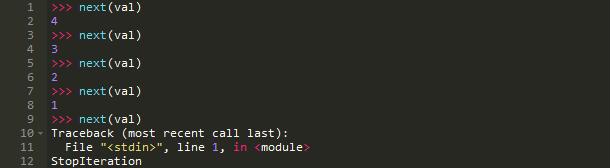 如果yield语句没有被调用(在我们的例子中,我们没能通过判断因为num小于等于0)抛出StopIteration异常:
