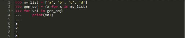 像列表生解析一样,生成器也可以使用相同的方式编写。不同的是它们返回一个生成器对象而不是一个列表: