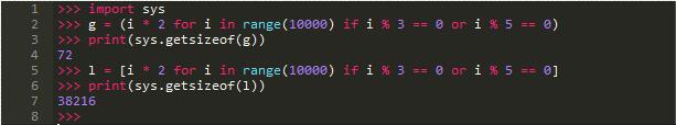 不同与列表,生产器是惰性执行的,即你要求一次,它执行一点并返回一个结果,你反复要求,它再依次把结果一个一个返回出来。所以在处理更大的数据集时,生成器有更高的内存效率。