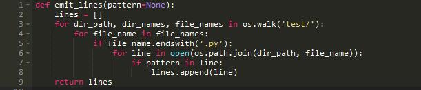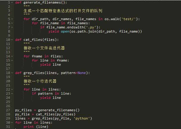 grep_files接收一个所有以.py为后缀的文件的所有行的迭代对象。同样地,cat_files接受一个目录下所有文件的迭代对象。