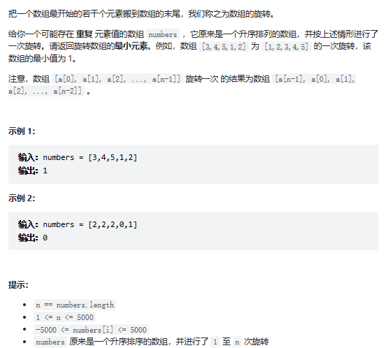 - number[mid] = number[j]时,由于重复元素的存在,我们并不能确定 numbers[mid]究竟在最小值的左侧还是右侧,由于它们的值相同,所以无论numbers[j]是不是最小值,都有一个它的替代品numbers[mid],因此我们可以忽略二分查找区间的右端点。