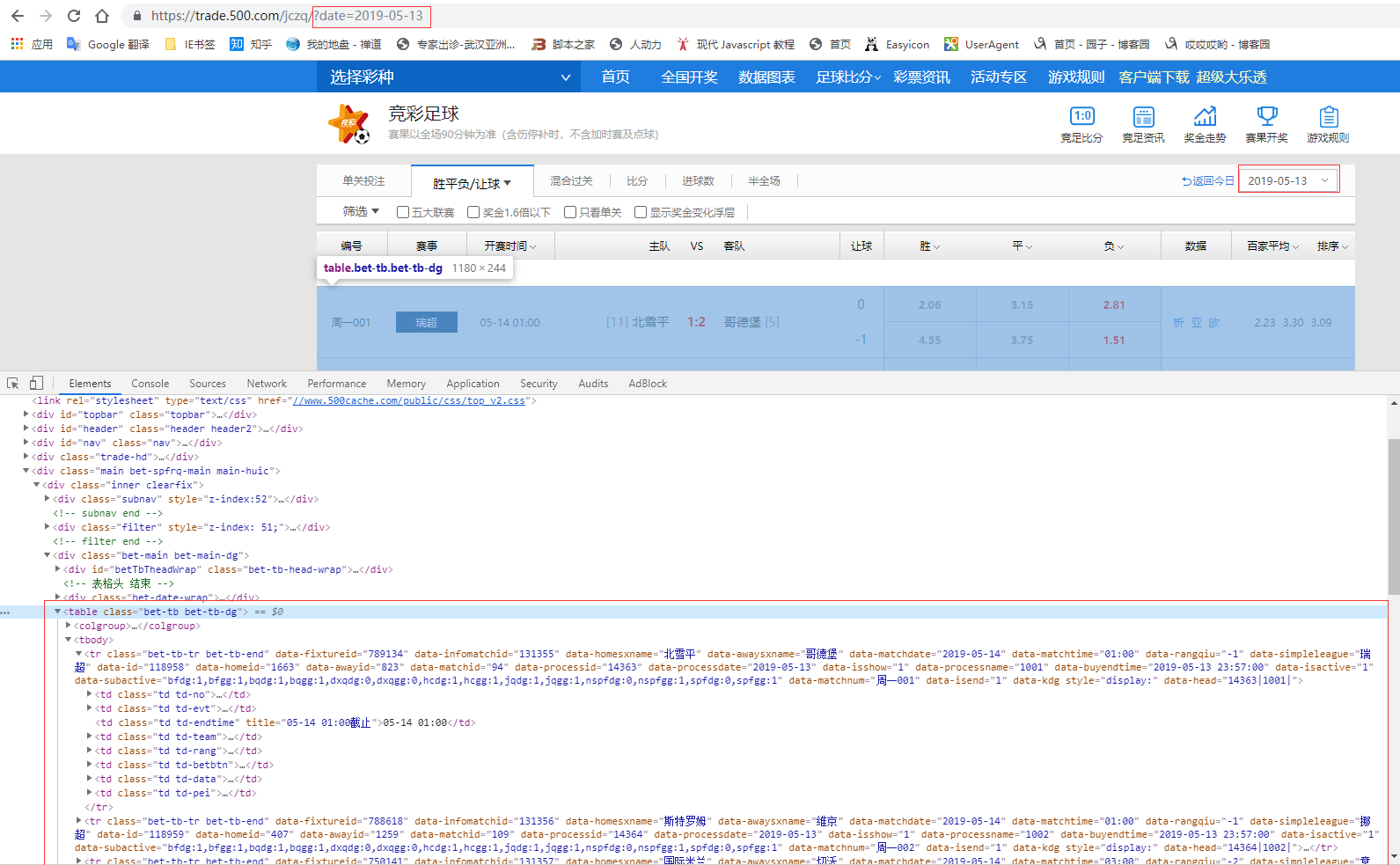 进入页面后,点击F12查看网页代码。通过查找,发现所有的比赛结果全部在 <table class="bet-tb bet-tb-dg">...</table>中,然后继续往下看