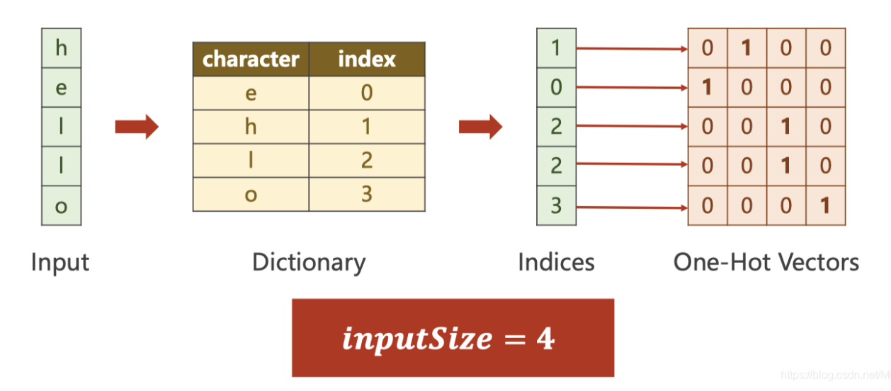 1 #基础数据 2 import torch 3 input_size = 4 4 hidden_size = 4 5 batch_size = 1 6 seq_len = 5 7 num_layers = 1 8 9 idx2char = ['e', 'h', 'l', 'o'] 10 x_data = [1, 0, 2, 3, 3] # hello中各个字符的下标 11 y_data = [3, 1, 2, 3, 2] # ohlol中各个字符的下标 12 13 one_hot_lookup = [[1, 0, 0, 0], 14 [0, 1, 0, 0], 15 [0, 0, 1, 0], 16 [0, 0, 0, 1]] 17 x_one_hot = [one_hot_lookup[x] for x in x_data] # (seqLen, inputSize) 18 19 inputs = torch.Tensor(x_one_hot).view(seq_len, batch_size, input_size) 20 labels = torch.LongTensor(y_data) 21 print(inputs.shape, labels.shape)