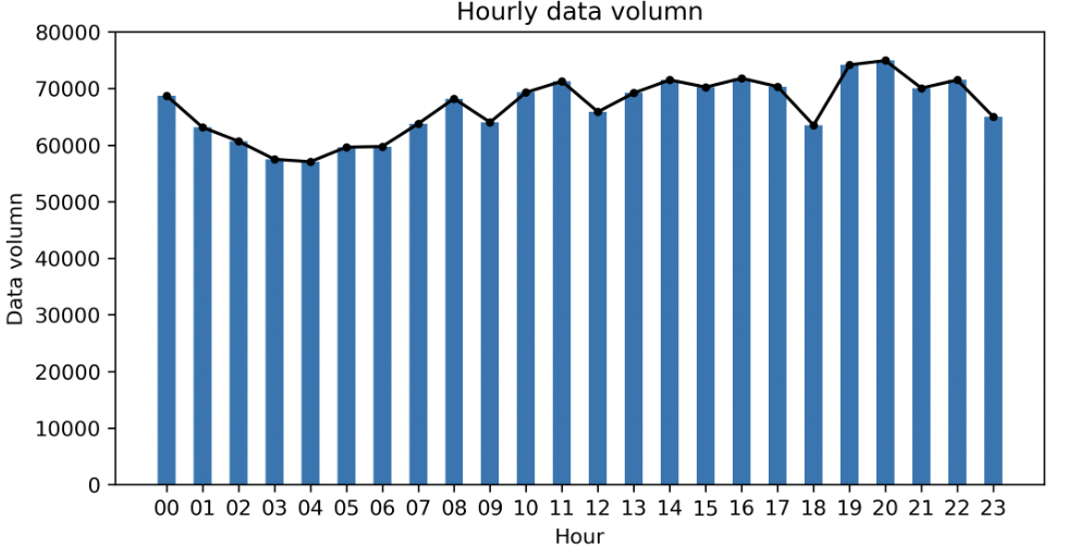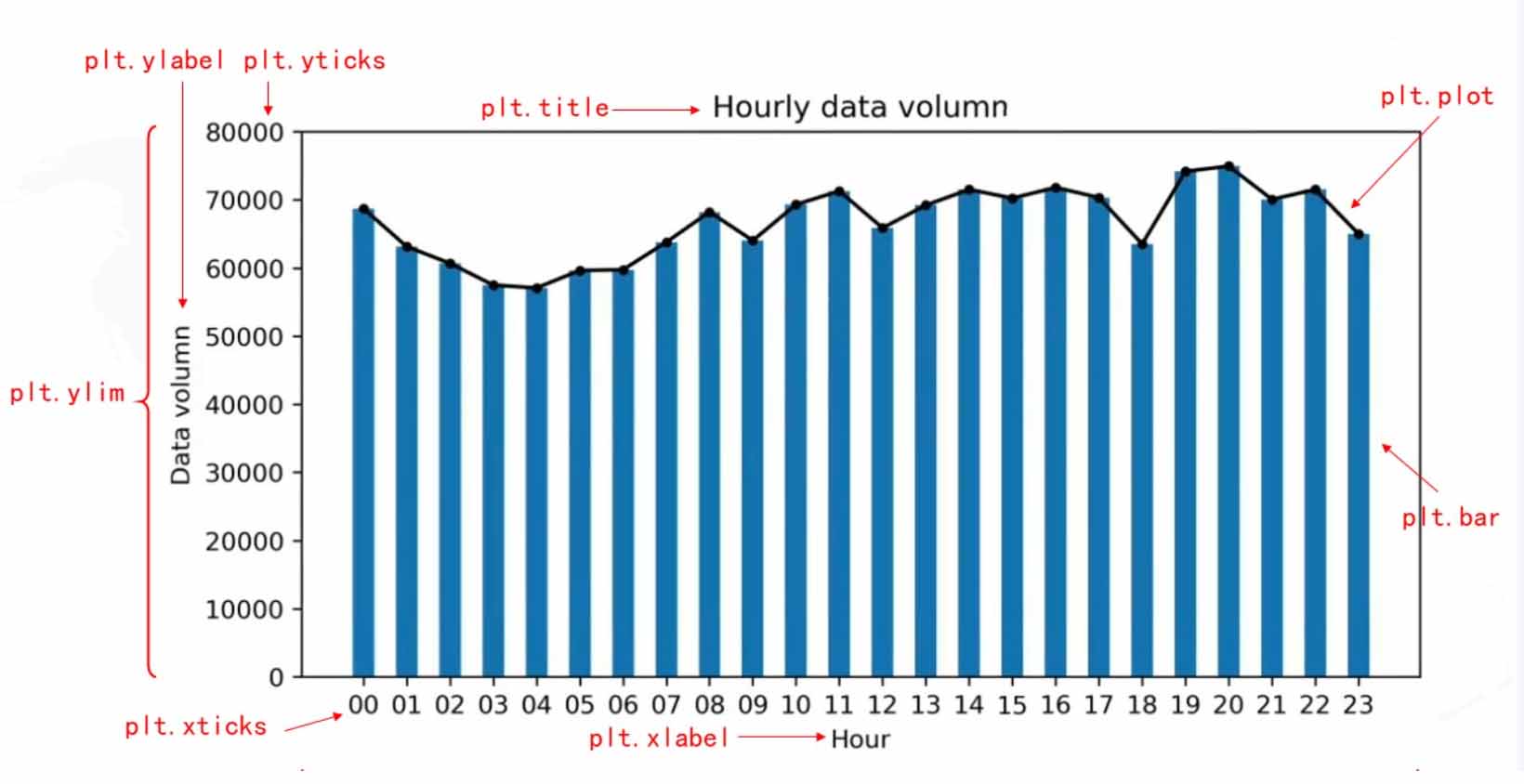 1 import matplotlib.pyplot as plt 2 fig = plt.figure(1,(8,4),dpi = 300) 3 ax = plt.subplot(111) 4 plt.sca(ax) 5 6 7 plt.plot(hourcount['Hour'],hourcount['count'],'k-') 8 plt.plot(hourcount['Hour'],hourcount['count'],'k.') 9 10 plt.bar(hourcount['Hour'],hourcount['count'],width = 0.5) 11 12 13 plt.ylim(0,80000) 14 plt.title('Hourly data volumn') 15 plt.xlabel('Hour') 16 plt.ylabel('Data volumn') 17 plt.savefig('test.png',format = 'png',bbox_inches = 'tight') 18 plt.show()
