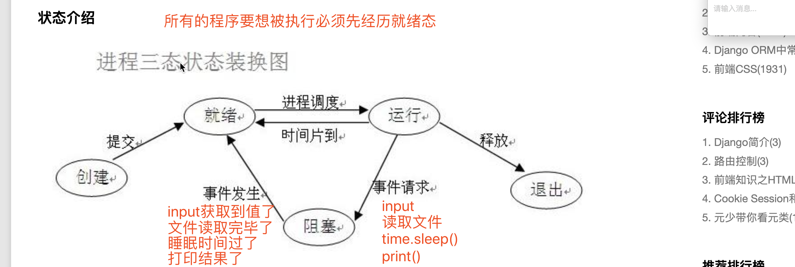 """描述的程序的运行状态""" 阻塞:阻塞态 非阻塞:就绪态、运行态 理想状态:我们应该让我们的写的代码永远处于就绪态和运行态之间切换最理想的组合就是
