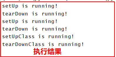 class MyTest(unittest.TestCase): def setUp(self): print 'setUp is running!' def tearDown(self): print 'tearDown is running!' def test_add(self): self.assertEqual(5,test_unittest.add(2,3)) def test_minus(self): self.assertEqual(2,test_unittest.minus(5,3)) class MyTest2(unittest.TestCase): @classmethod def setUpClass(cls): print 'setUpClass is running!' @classmethod def tearDownClass(cls): print 'tearDownClass is running!' def test_multil(self): self.assertEqual(6,test_unittest.multi(2,3)) def test_divide(self): self.assertEqual(2,test_unittest.divide(6,2))