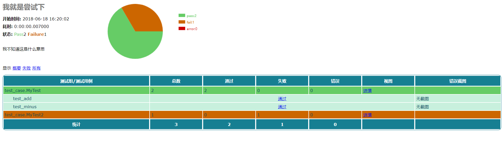 #!/usr/bin/env python # _*_ coding:utf-8 _*_ import test_unittest from test_case import * import unittest from HTMLTestRunner_cn import HTMLTestRunner if __name__ == '__main__': suite = unittest.TestSuite() suite.addTests(unittest.TestLoader().loadTestsFromNames(['test_case.MyTest','test_case.MyTest2'])) # with open('result1.txt','a') as f: # runner = unittest.TextTestRunner(stream=f,verbosity=2) # runner.run(suite) with open('runner.html','a') as f: runner = HTMLTestRunner(stream=f, verbosity=2, title='我就是尝试下',description='我不知道这是什么意思') runner.run(suite)