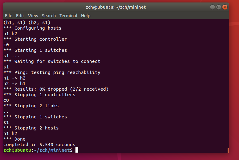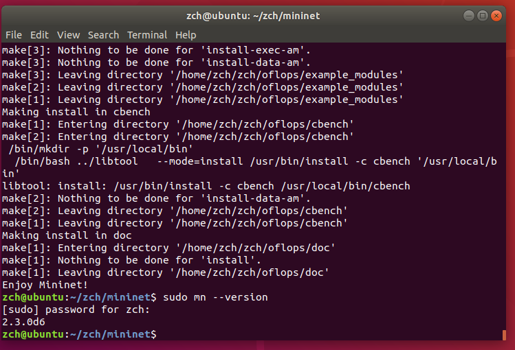 $ mkdir zch //新建 sdn 目录(名称可自定义),所有的应用安装在该目录下 $ sudo apt-get install git //安装 git $ cd zch //进入 zch 目录 $ git clone git://github.com/mininet/mininet //下载 mininet 源码 $ cd mininet $ sudo util/install.sh -a //在 mininet 目录下执行,-a 表示完整安装 $ sudo mn --version //查看版本