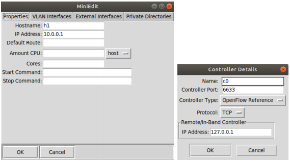 鼠标右键点击 Host 和 Controller,选择设置属性(Properties):Host 部分主要是设置主机 ip,以及 VLAN 等扩展设置。每台主机逐台操作;Controller 部分主要是