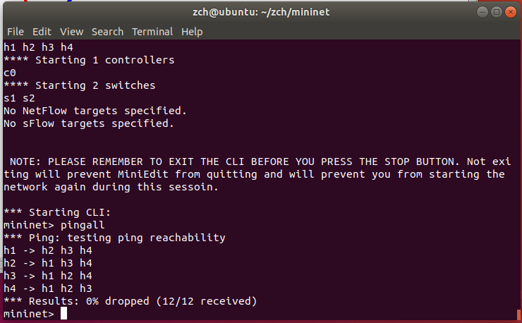 点击左下角的 Run,运行拓扑,由于开启了 CLI,可使用 pingall 命令测试主机的连通性,并做其他扩展操作。