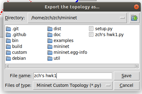 拓扑生成并确认无误之后,可以点击 miniedit 左上角的 File 菜单,选择 ExportLevel 2 Script,将拓扑保存为 Python 脚本,方便之后执行脚本一键生成。