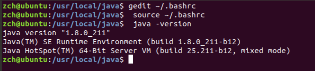 $ sudo mkdir /usr/local/java $ sudo tar -zxvf jdk-8u211-linux-x64.tar.gz //需将 jdk 压缩包提前放在相应目录下 $ gedit ~/.bashrc