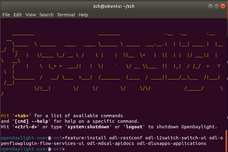 $ feature:install odl-restconf odl-l2switch-switch-ui odl-openflowplugin-flow-services-ui odl-mdsal-apidocs odl-dluxapps-applications