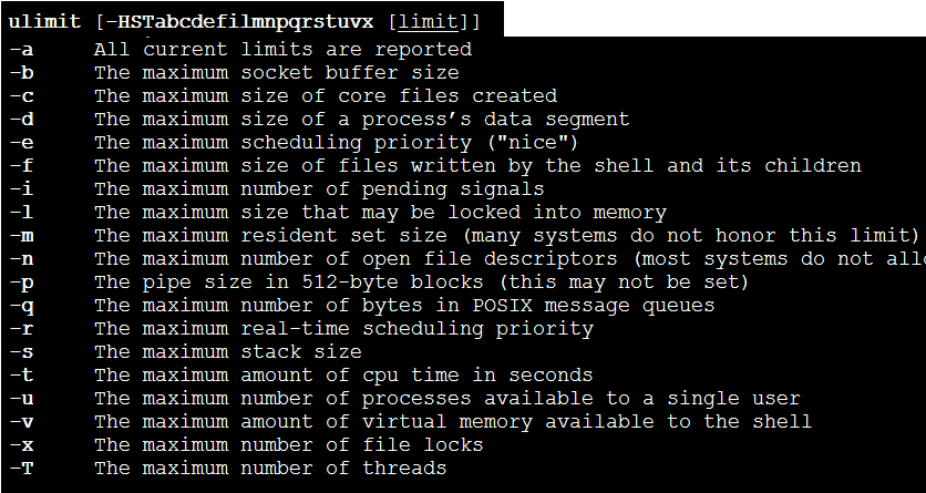 如果既没有指定-H选项也没有指定-S选项,那么硬限制(hard limit)和软限制(soft limit)都会被设置。