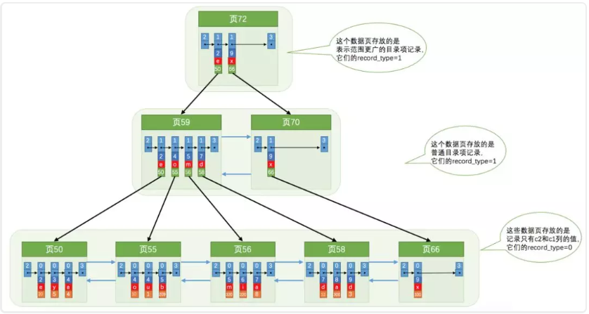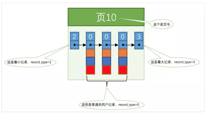 如上图所示,每页数据都会被目录记录下来,那么问题来了,目录放在哪里呢,mysql的专家想来想去发现还是放在一个页里吧,然后将他的record_type变成1,标识这是目录数据,然后也按照顺序排列就是下面这样