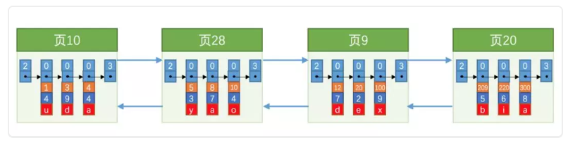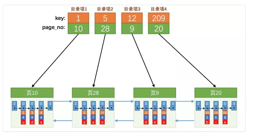 如上所示,每个页之前有双向箭头标识下页和上页地址,并且从左向右索引值时升序排列的,不过这些数据在物理上其实并不挨着,想要查询效率高,必须要给他们建立目录,这个目录使用每个页中最小的索引值和页号组成,