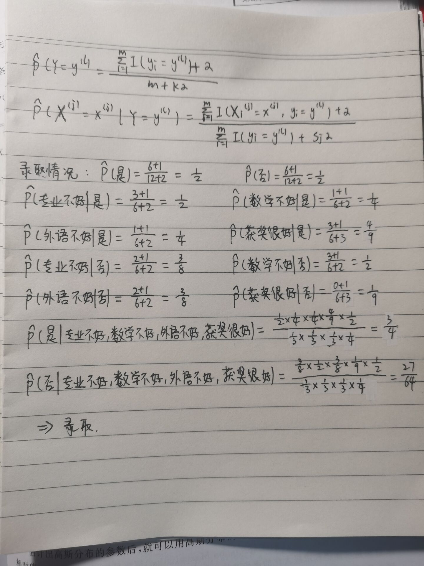 1.下表中是某大学一位研究生导师带过的硕士研究生录取情况表,根据该表建立朴素贝叶斯模型,现有一名上线考生想报考该导师,考生的特点是专业、数学和外语都不好,获奖情况很好,请你判断该生能否被录取。