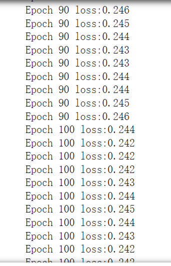 class OurNeuralNetwork: def __init__(self): #特征值 self.w1=np.random.normal() self.w2=np.random.normal() self.w3=np.random.normal() self.w4=np.random.normal() self.w5=np.random.normal() self.w6=np.random.normal() #截距 self.b1=np.random.normal() self.b2=np.random.normal() self.b3=np.random.normal() def feedforward(self,x): h1=sigmoid(self.w1*x[0]+self.w2*x[1]+self.b1) h2=sigmoid(self.w3*x[0]+self.w4*x[1]+self.b2) o1=sigmoid(self.w5*h1+self.w6*h2+self.b3) return o1 def train(self,data,all_y_trues): learn_rate=0.1 #步长 epochs=1000 #循环次数 for epoch in range(epochs): for x,y_true in zip(data,all_y_trues): sum_h1=self.w1*x[0]+self.w2*x[1]+self.b1 h1=sigmoid(sum_h1) sum_h2=self.w3*x[0]+self.w4*x[1]+self.b2 h2=sigmoid(sum_h2) sum_o1=self.w5*h1+self.w6*h2+self.b3 o1=sigmoid(sum_o1) y_pred=o1 d_L_d_ypred=-2*(y_true-y_pred) #Neuron o1 d_ypred_d_w5=h1*deriv_sigmoid(sum_o1) d_ypred_d_w6=h2*deriv_sigmoid(sum_o1) d_ypred_d_b3=deriv_sigmoid(sum_o1) d_ypred_d_h1=self.w5*deriv_sigmoid(sum_o1) d_ypred_d_h2=self.w6*deriv_sigmoid(sum_o1) #Neuron h1 d_h1_d_w1=x[0]*deriv_sigmoid(sum_h1) d_h1_d_w2=x[1]*deriv_sigmoid(sum_h1) d_h1_d_b1=deriv_sigmoid(sum_h1) #Neuron h2 d_h2_d_w3=x[0]*deriv_sigmoid(sum_h2) d_h2_d_w4=x[1]*deriv_sigmoid(sum_h2) d_h2_d_b2=deriv_sigmoid(sum_h2) #Neuron h1 self.w1-=learn_rate*d_L_d_ypred*d_ypred_d_h1*d_h1_d_w1 self.w2-=learn_rate*d_L_d_ypred*d_ypred_d_h1*d_h1_d_w2 self.b1-=learn_rate*d_L_d_ypred*d_ypred_d_h1*d_h1_d_b1 #Neuron h2 self.w3-=learn_rate*d_L_d_ypred*d_ypred_d_h2*d_h2_d_w3 self.w4-=learn_rate*d_L_d_ypred*d_ypred_d_h2*d_h2_d_w4 self.b2-=learn_rate*d_L_d_ypred*d_ypred_d_h2*d_h2_d_b2 #Neuron o1 self.w5-=learn_rate*d_L_d_ypred*d_ypred_d_w5 self.w6-=learn_rate*d_L_d_ypred*d_ypred_d_w6 self.b3-=learn_rate*d_L_d_ypred*d_ypred_d_b3 if epoch%10==0: y_preds=np.apply_along_axis(self.feedforward,1,data) loss=mse_loss(all_y_trues,y_preds) print("Epoch %d loss:%.3f" % (epoch,loss))