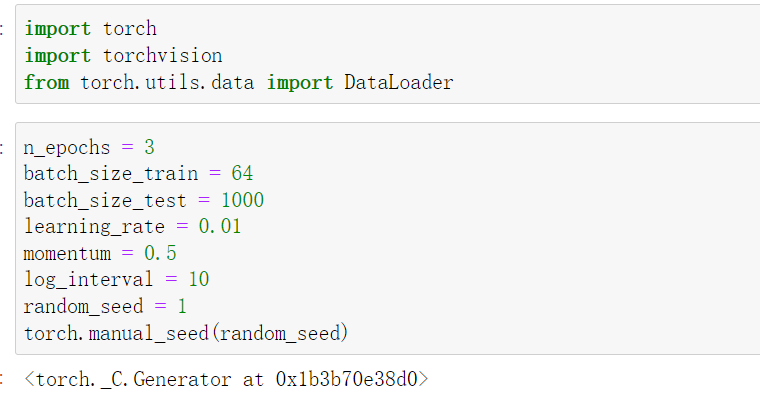 n_epochs = 3 batch_size_train = 64 batch_size_test = 1000 learning_rate = 0.01 momentum = 0.5 log_interval = 10 random_seed = 1 torch.manual_seed(random_seed)
