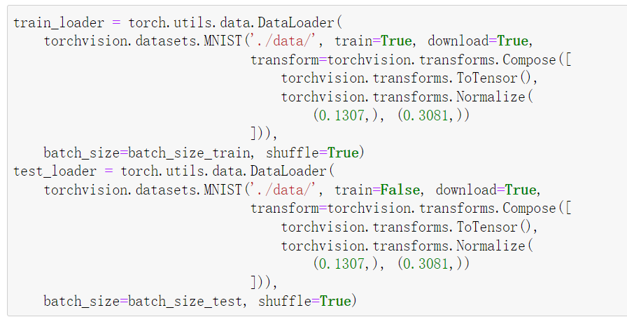 train_loader = torch.utils.data.DataLoader( torchvision.datasets.MNIST('./data/', train=True, download=True, transform=torchvision.transforms.Compose([ torchvision.transforms.ToTensor(), torchvision.transforms.Normalize( (0.1307,), (0.3081,)) ])), batch_size=batch_size_train, shuffle=True) test_loader = torch.utils.data.DataLoader( torchvision.datasets.MNIST('./data/', train=False, download=True, transform=torchvision.transforms.Compose([ torchvision.transforms.ToTensor(), torchvision.transforms.Normalize( (0.1307,), (0.3081,)) ])), batch_size=batch_size_test, shuffle=True)