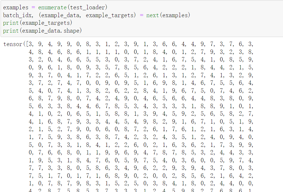 examples = enumerate(test_loader) batch_idx, (example_data, example_targets) = next(examples) print(example_targets) print(example_data.shape)