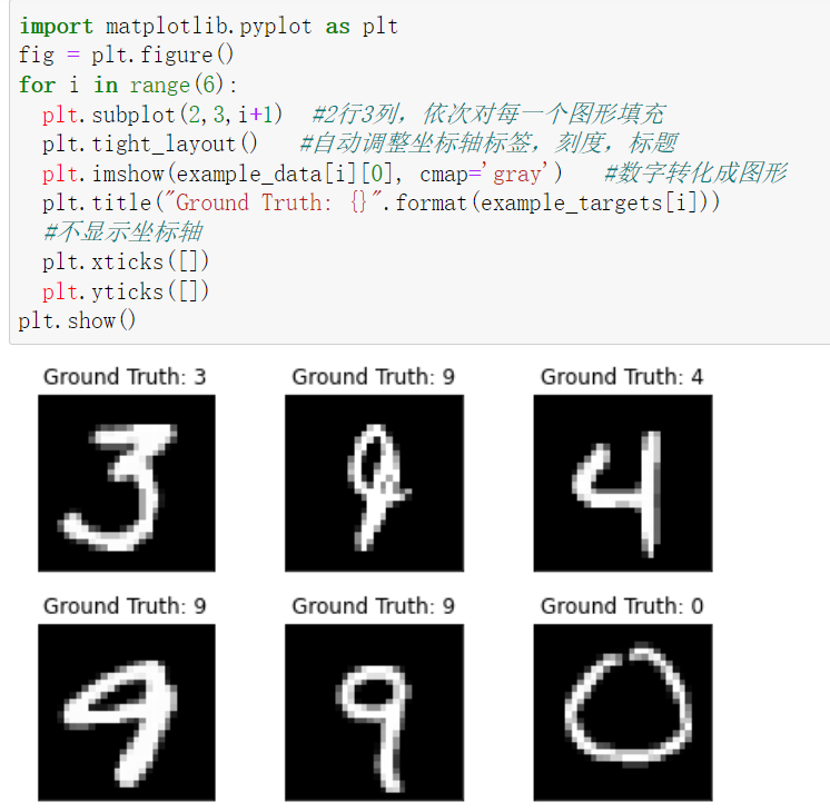 import matplotlib.pyplot as plt fig = plt.figure() for i in range(6): plt.subplot(2,3,i+1) #2行3列,依次对每一个图形填充 plt.tight_layout() #自动调整坐标轴标签,刻度,标题 plt.imshow(example_data[i][0], cmap='gray') #数字转化成图形 plt.title("Ground Truth: {}".format(example_targets[i])) #不显示坐标轴 plt.xticks([]) plt.yticks([]) plt.show()