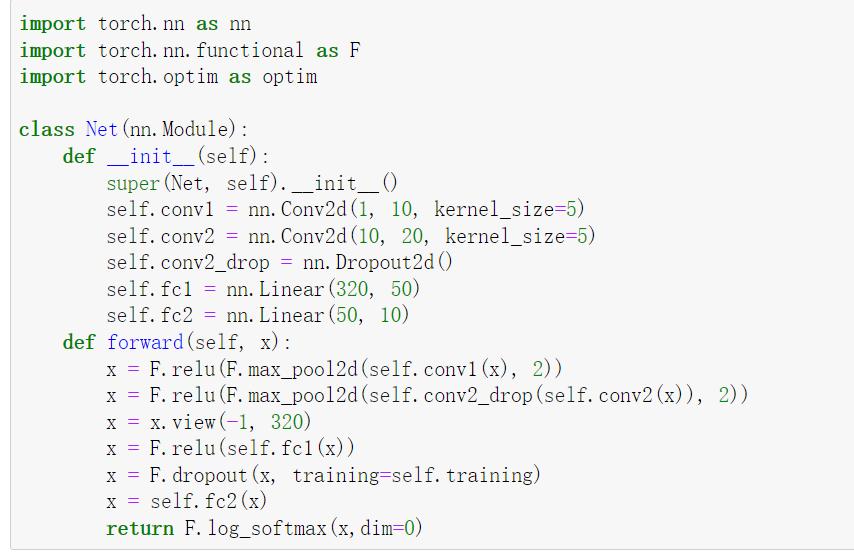 import torch.nn as nn import torch.nn.functional as F import torch.optim as optim class Net(nn.Module): def __init__(self): super(Net, self).__init__() self.conv1 = nn.Conv2d(1, 10, kernel_size=5) self.conv2 = nn.Conv2d(10, 20, kernel_size=5) self.conv2_drop = nn.Dropout2d() self.fc1 = nn.Linear(320, 50) self.fc2 = nn.Linear(50, 10) def forward(self, x): x = F.relu(F.max_pool2d(self.conv1(x), 2)) x = F.relu(F.max_pool2d(self.conv2_drop(self.conv2(x)), 2)) x = x.view(-1, 320) x = F.relu(self.fc1(x)) x = F.dropout(x, training=self.training) x = self.fc2(x) return F.log_softmax(x,dim=0)