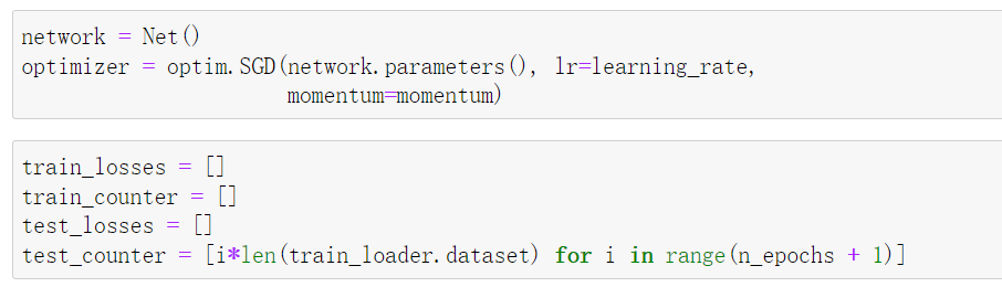 network = Net() optimizer = optim.SGD(network.parameters(), lr=learning_rate, momentum=momentum)