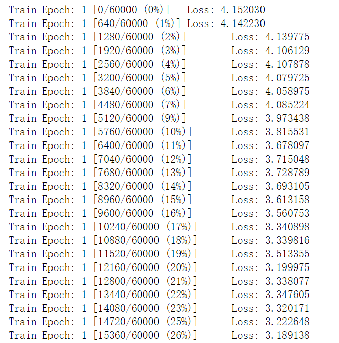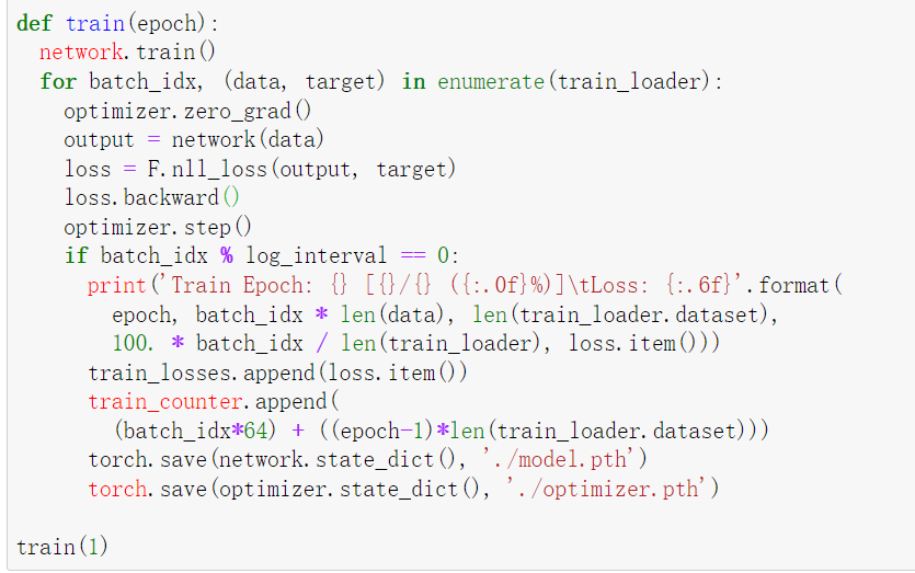 def train(epoch): network.train() for batch_idx, (data, target) in enumerate(train_loader): optimizer.zero_grad() output = network(data) loss = F.nll_loss(output, target) loss.backward() optimizer.step() if batch_idx % log_interval == 0: print('Train Epoch: {} [{}/{} ({:.0f}%)]\tLoss: {:.6f}'.format( epoch, batch_idx * len(data), len(train_loader.dataset), 100. * batch_idx / len(train_loader), loss.item())) train_losses.append(loss.item()) train_counter.append( (batch_idx*64) + ((epoch-1)*len(train_loader.dataset))) torch.save(network.state_dict(), './model.pth') torch.save(optimizer.state_dict(), './optimizer.pth') train(1)