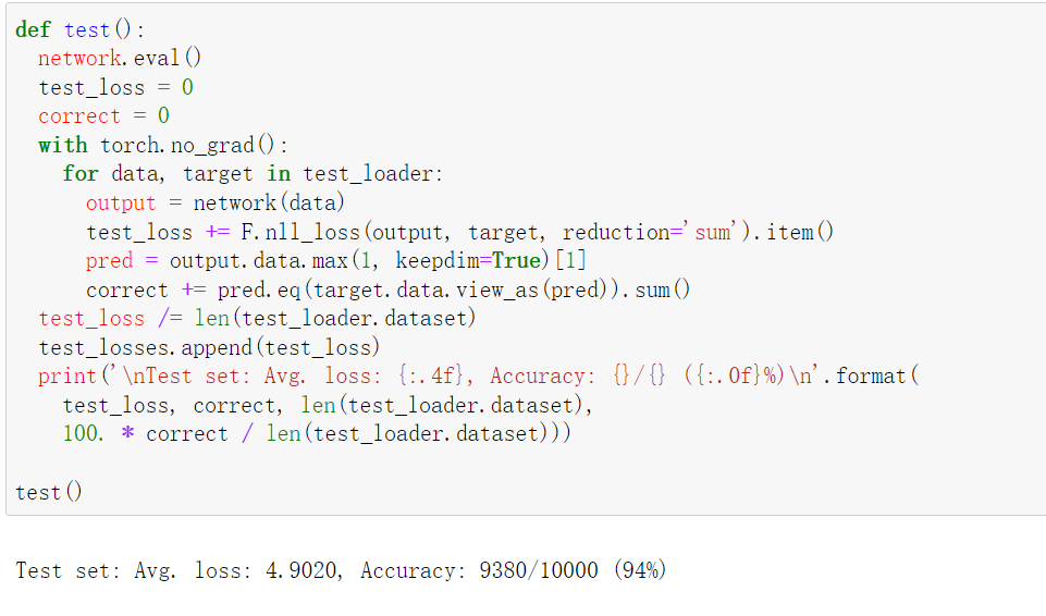 def test(): network.eval() test_loss = 0 correct = 0 with torch.no_grad(): for data, target in test_loader: output = network(data) test_loss += F.nll_loss(output, target, reduction='sum').item() pred = output.data.max(1, keepdim=True)[1] correct += pred.eq(target.data.view_as(pred)).sum() test_loss /= len(test_loader.dataset) test_losses.append(test_loss) print('\nTest set: Avg. loss: {:.4f}, Accuracy: {}/{} ({:.0f}%)\n'.format( test_loss, correct, len(test_loader.dataset), 100. * correct / len(test_loader.dataset))) test()