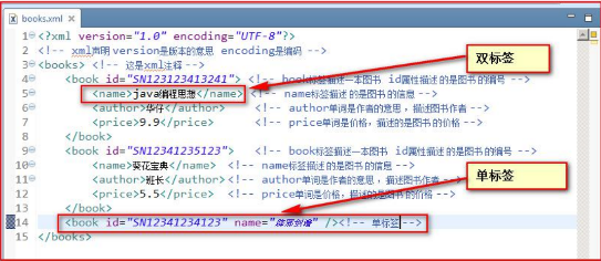 3)xml 中的元素(标签)也 分成 单标签和双标签: