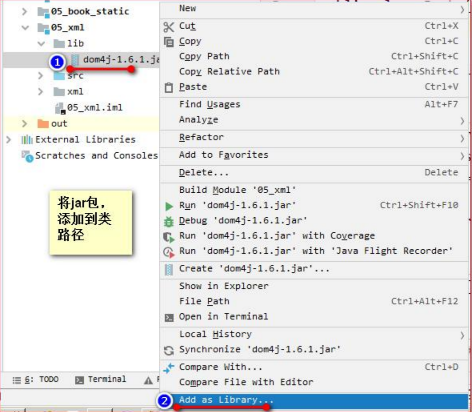 创建一个 lib 目录,并添加 dom4j 的 jar 包。并添加到类路径。