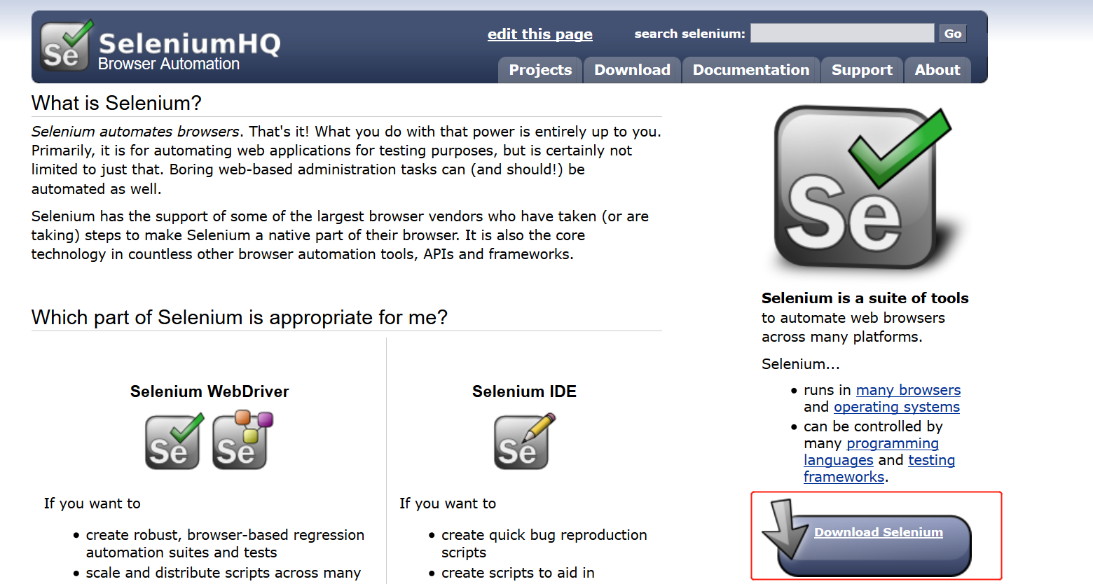 官网网址:https://www.seleniumhq.org/,进入网站点击:download 如图: