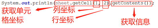其中sheet.getCell(1, 2)是获取坐标信息,前者为列坐标,后者为行坐标; getContents()是获取具体信息,如图: