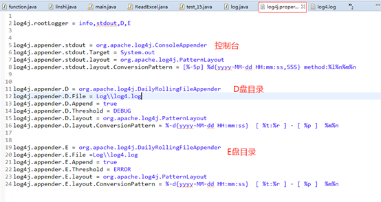 1 log4j.rootLogger = info,stdout,D,E 2 3 log4j.appender.stdout = org.apache.log4j.ConsoleAppender 4 log4j.appender.stdout.Target = System.out 5 log4j.appender.stdout.layout = org.apache.log4j.PatternLayout 6 log4j.appender.stdout.layout.ConversionPattern = [%-5p] %d{yyyy-MM-dd HH:mm:ss,SSS} method:%l%n%m%n 7 8 log4j.appender.D = org.apache.log4j.DailyRollingFileAppender 9 log4j.appender.D.File = Log\\log4.log 10 log4j.appender.D.Append = true 11 log4j.appender.D.Threshold = DEBUG 12 log4j.appender.D.layout = org.apache.log4j.PatternLayout 13 log4j.appender.D.layout.ConversionPattern = %-d{yyyy-MM-dd HH:mm:ss} [ %t:%r ] - [ %p ] %m%n 14 15 log4j.appender.E = org.apache.log4j.DailyRollingFileAppender 16 log4j.appender.E.File =Log\\log4.log 17 log4j.appender.E.Append = true 18 log4j.appender.E.Threshold = ERROR 19 log4j.appender.E.layout = org.apache.log4j.PatternLayout 20 log4j.appender.E.layout.ConversionPattern = %-d{yyyy-MM-dd HH:mm:ss} [ %t:%r ] - [ %p ] %m%n