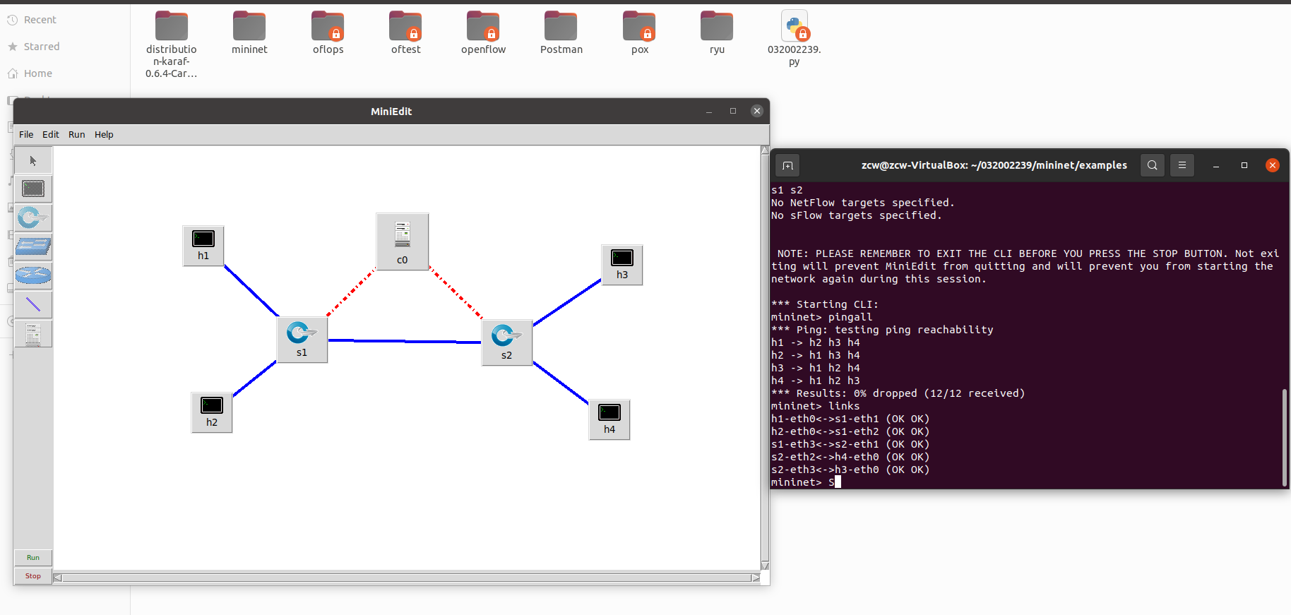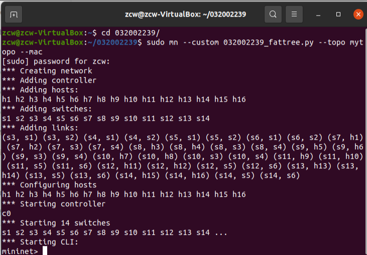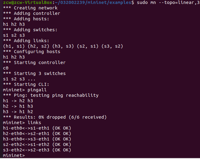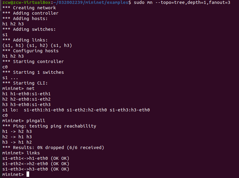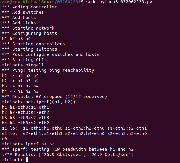 心得体会:本次实验帮助我了解了虚拟机的一些基本操作,同时学会使用Mininet创建简单拓扑结构,在实验过程中出现了不少的问题,有一些是关于linux的操作问题,比如如何删除多余的文件等,不过这些问题通过搜索还是容易解决的,还有一些是关于结果出现偏差的问题,比如运行得不到结果,丢包率高等,这些问题需要回到原理以及Mininet命令上解决,虽然本次实验中还有许多不太理解的地方,但我相信能通过后续的学习进一步的深化自己的认识。