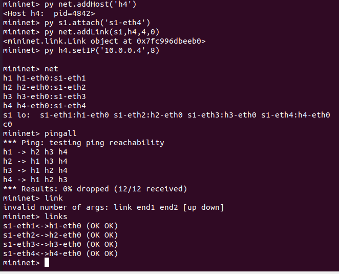题目3.无法将新建的主机与交换机进行ping并且有50%的丢包率,解决方法 py s1.attach('s1-eth4'),py h4.setIP('10.0.0.4')