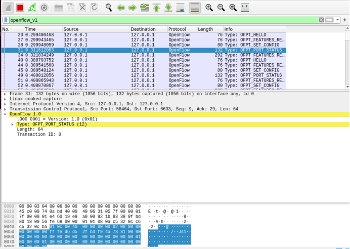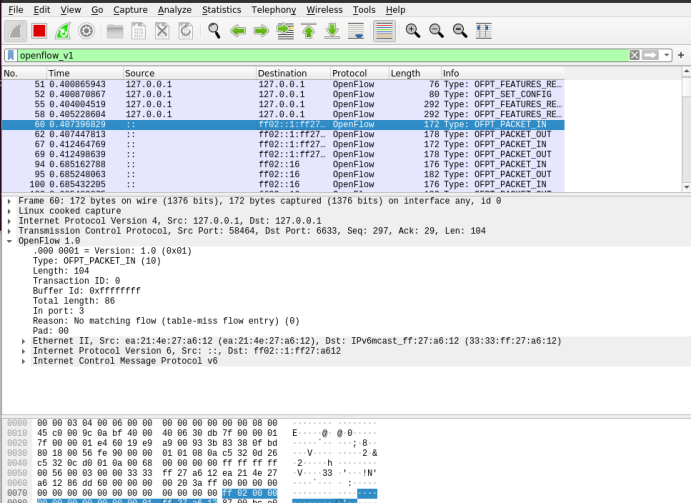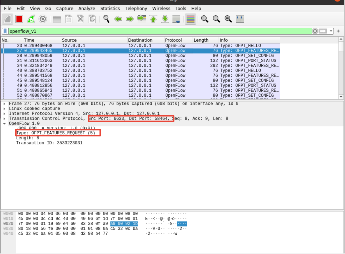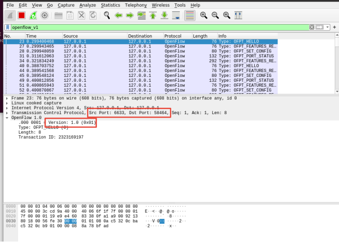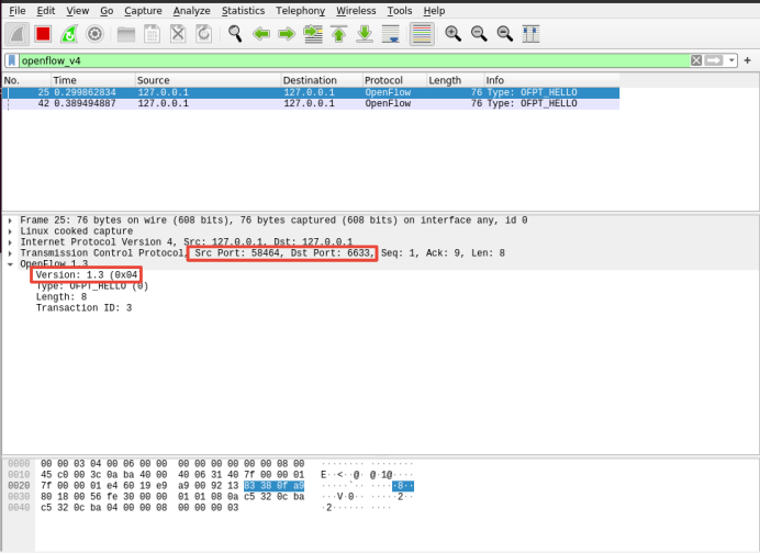 控制器6633端口(我最高能支持OpenFlow 1.0) ---> 交换机58464端口
