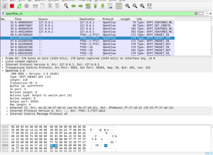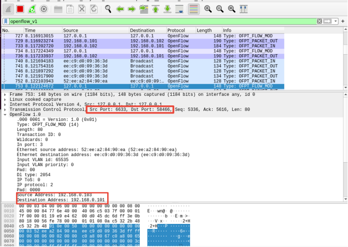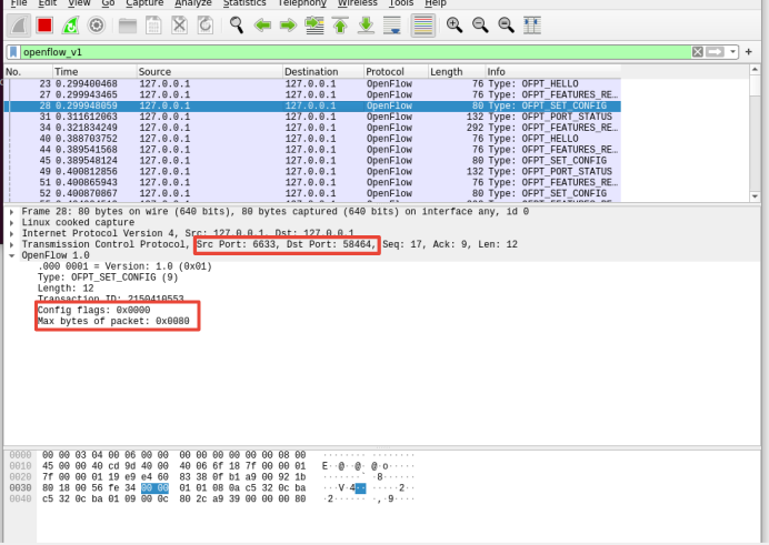 分析抓取的flow_mod数据包,控制器通过6633端口向交换机58464端口 下发流表项,指导数据的转发处理
