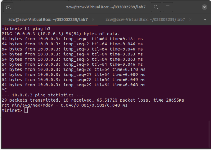 (3) 下发硬超时流表,实现拓扑内主机h1和h3网络中断20s。