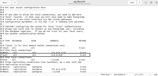 2:pg_hba.conf配置(trust代表不需要密码,md5代表需要密码)